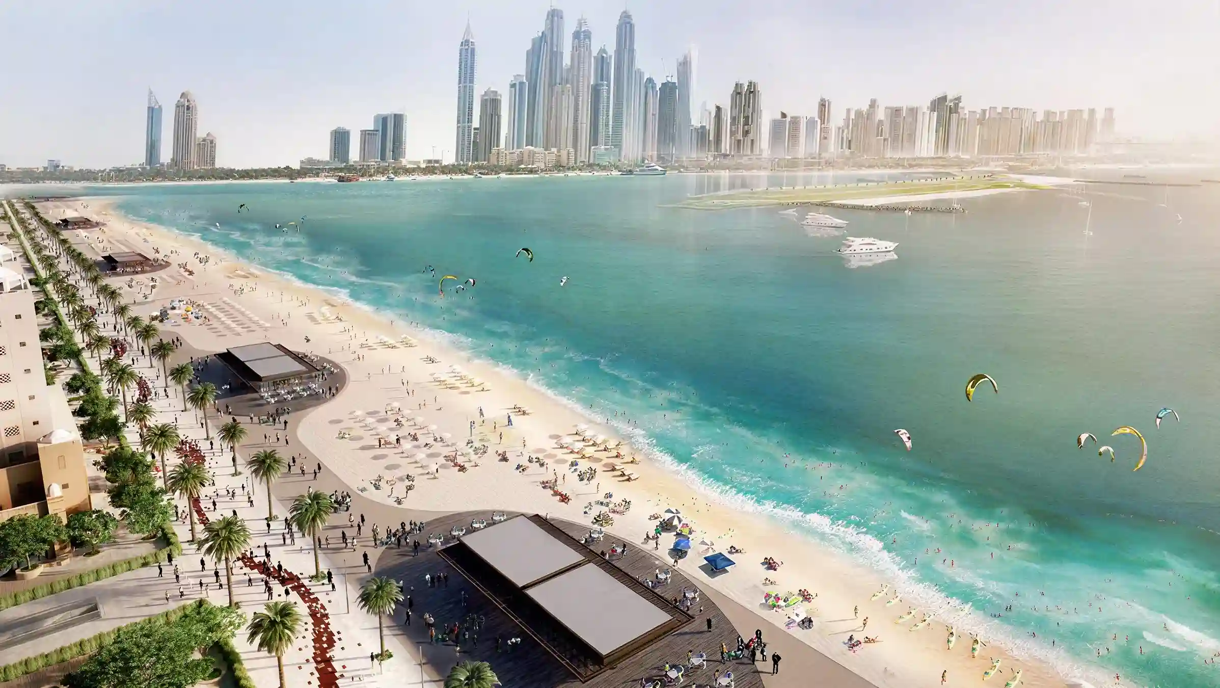 A 1.5 km stretch on the trunk, Palm West Beach is one of Dubai’s most vibrant lifestyle hubs. It’s lined with chic hotels, buzzing beach clubs, and a global mix of dining options. By day, it’s perfect for family strolls and watersports; by night, it transforms into a lively destination with rooftop lounges and sunset dining.